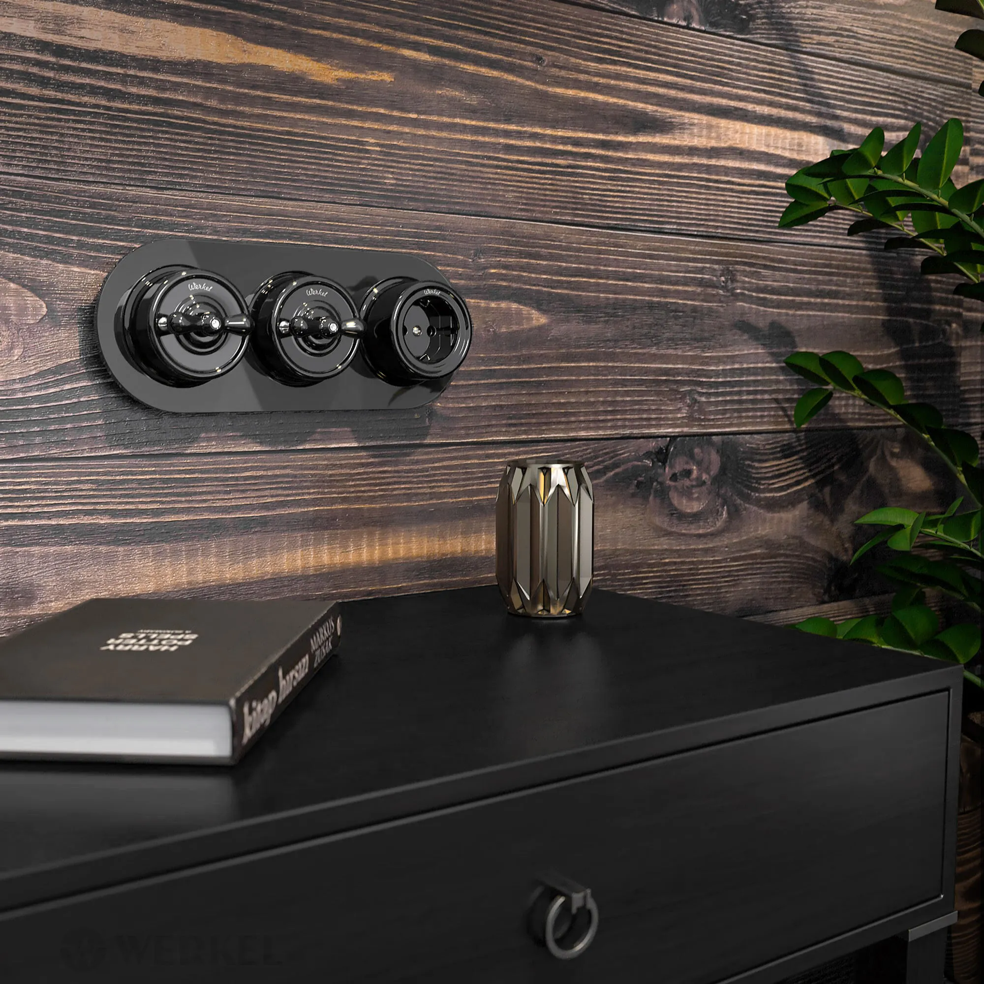 Гладкая стеклянная поверхность рамки отражает свет, создавая эффект глубины и объема, что делает ее идеальным фоном для декоративных элементов, таких как ретро переключатели и розетки. Рамка легко монтируется и совместима с различными моделями электроустановочных изделий из коллекций Werkel.